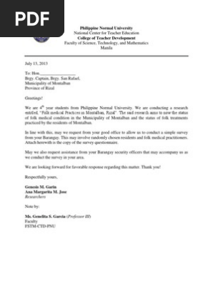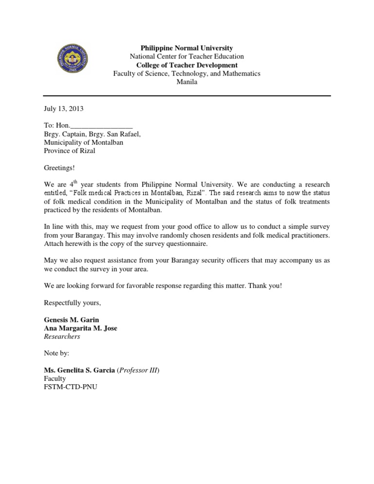 Permission Letter To Conduct Research In Barangay : Permission Letter To Conduct Survey Science Survey : It is important to use the right format when writing the permission request letter.. Permission letter for research a permission letter for research is written in respect of a request letter for conducting a research program in a certain field of the interest. This letter is always addressed to the higher authority by a person or the group that is planning to hold the event. State the purpose, the expected length/days that you will conduct a survey and that you will promise to keep the records confidential. Because of this, the letter is always written in a formal way. To conduct a survey to a barangay, first, you have to make a letter to the barangay captain or the respective officers.